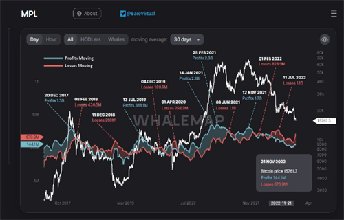 “在大多数情况下,Whalemap的每月MPL几乎可以确定全球$BTC的底部,”Baro Virtual在11月22日的Twitter评论中写道: