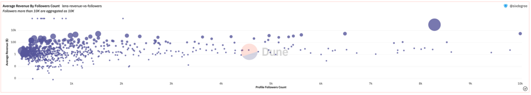 从总体收益金额来说,基本符合收益与粉丝量成正相关的逻辑。创作者经济中,拥有 5w 粉丝以上(算是 Lens 顶流)的收益占整体收益的 37%。