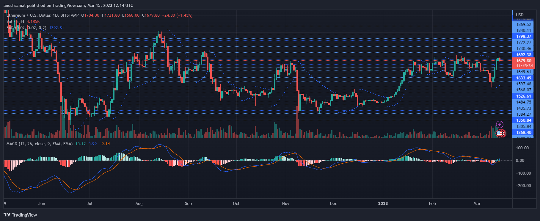 目前,ETH 的交易价格为 1,686 美元。在突破 1,430 美元大关后,山寨币继续突破多个阻力位。最高价格上限为 1,700 美元,突破该上限后,该代币可分别见证阻力位 1,770 美元。