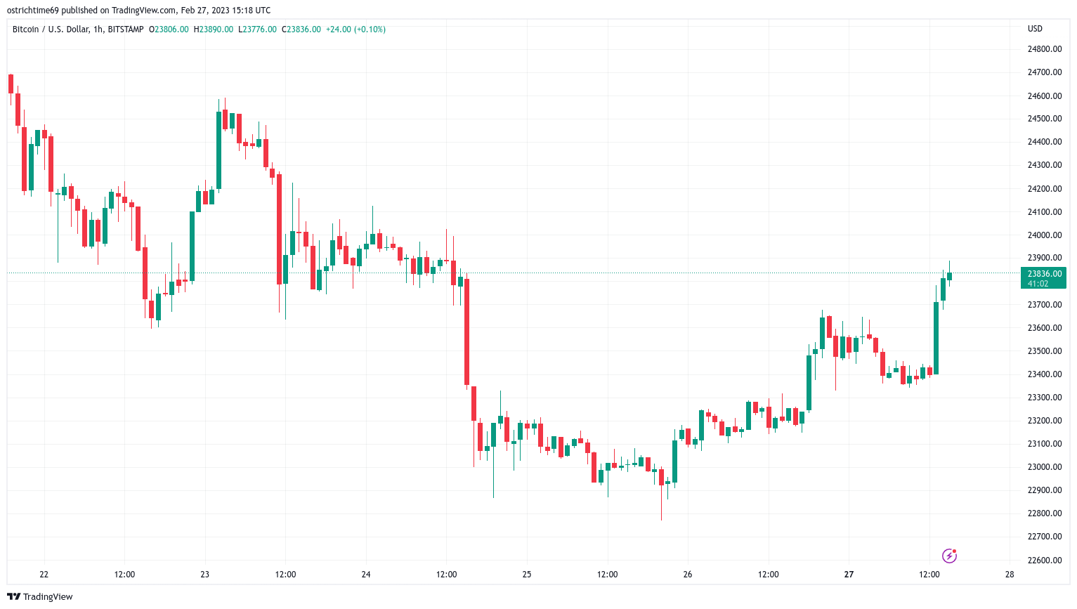 比特币在 2 月 27 日华尔街开盘时,由于强劲的每周收盘价转化为进一步上涨,比特币价格上涨至 24,000 美元。