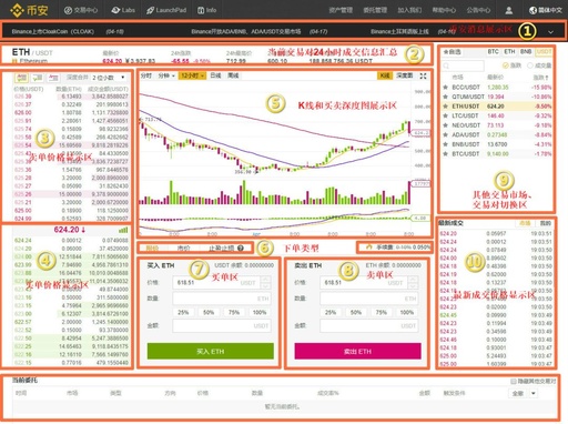 ①区域为币安消息展示区;②区域为当前交易对24小时成交信息汇总;③区域为卖单价格显示区;④区域为买单价格显示区;⑤区域为K线和买卖深度图展示区;⑥区域为下单类型;⑦区域为买单区;⑧区域为卖单区;⑨区域为其他交易市场、交易对切换区;⑩区域为最新成交价格显示区。