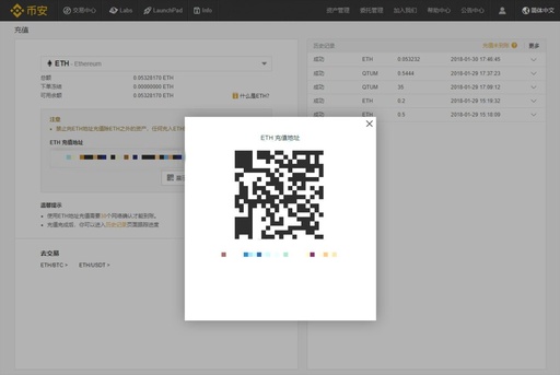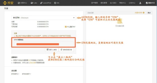 以ETH为例,输入所选币种“ETH”,选择“ETH”可获取ETH充值地址,复制该地址可进行充值或通过点击“展示二维码”进行扫码充值。