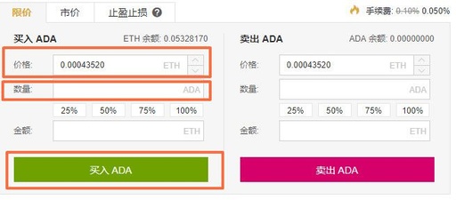 用户进入交易中心的下单区域,参考区域③、④买卖区价格,输入合适的ADA购买价、输入数量,点击买入ADA,完成购买。(卖单同理)