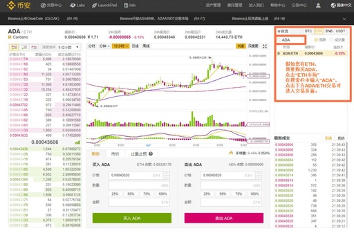 假如您有ETH,想要购买ADA,点击“ETH市场”在搜索栏中输入“ADA”,点击下方ADA/ETH交易对进入交易页面。